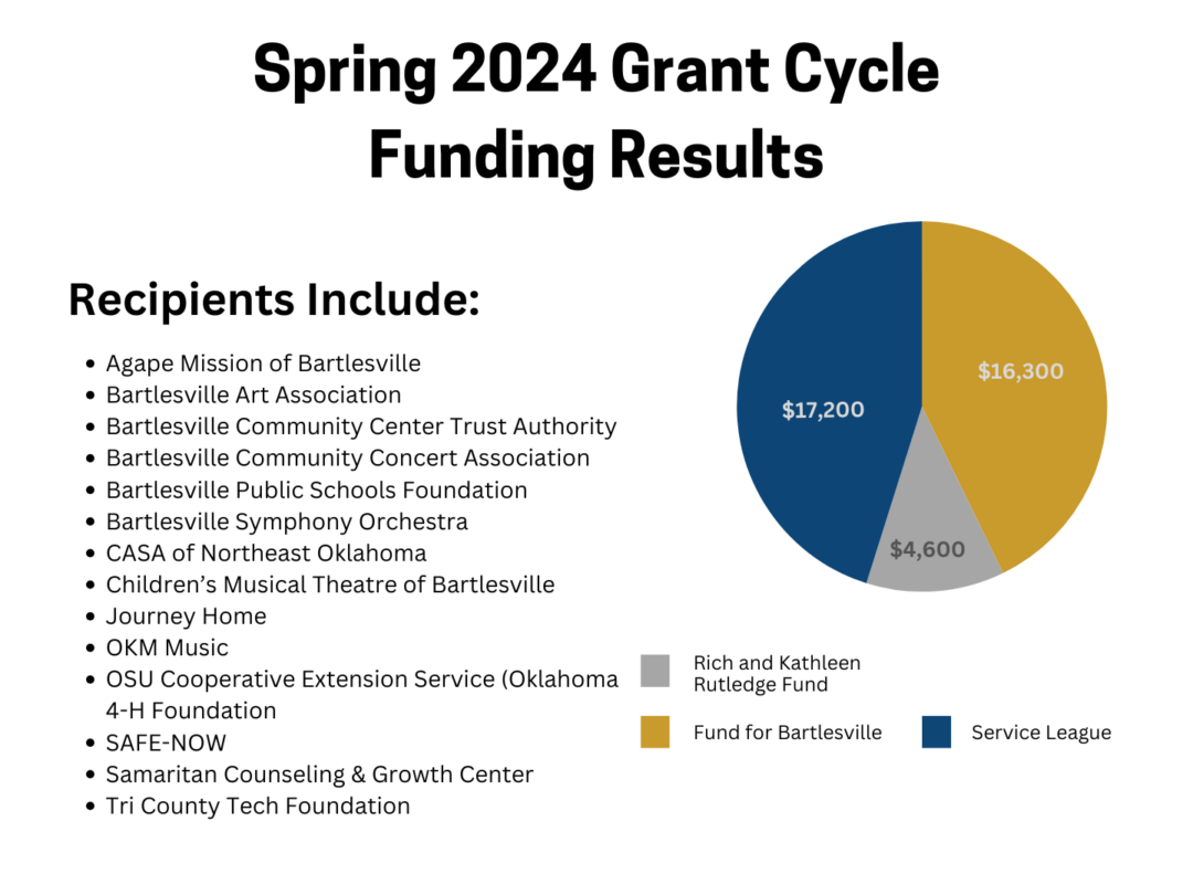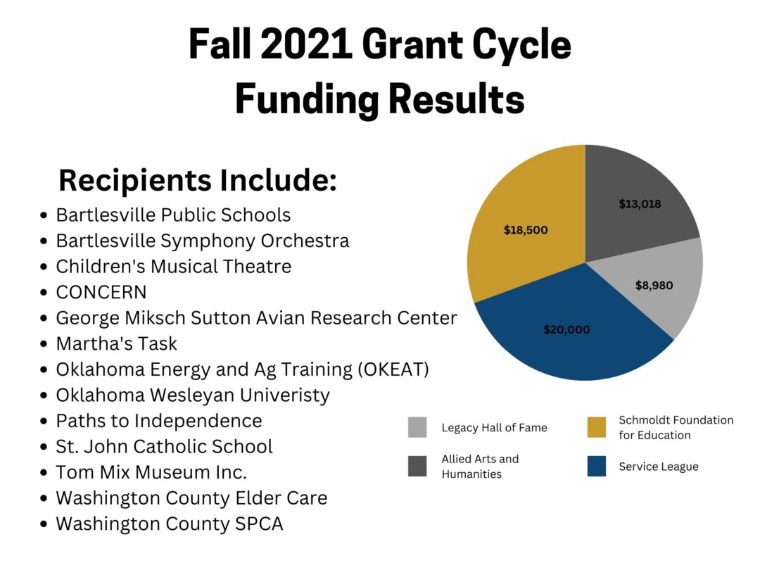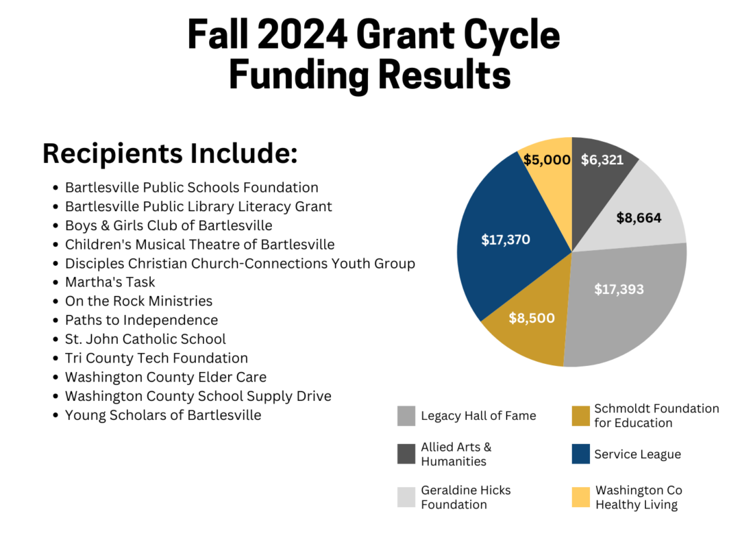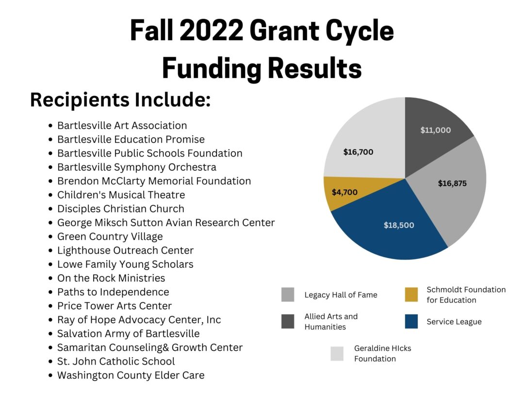 Past Awardees Past Awardees Spring 2025 Grant Awardees Fall 2024 Grant Awardees Grants Past Awardees Grant Acceptance and Reporting Grants FAQ Allied Arts & Humanities Fund Grant – Operating Support Allied Arts & Humanities Fund Grant – Program Support Dr. Stan DeFehr Memorial Medical Education Grant Early Childhood Education Support Fund Fund for Bartlesville Geraldine Hicks Grant Legacy Hall of Fame Fund Rich and Kathleen Rutledge Grant Fund Schmoldt Family Foundation for Education Grant Fund Service League Fund Washington County Healthy Living Fund Grant information is subject to change. Please review this page regularly for the most accurate information. Incomplete applications will NOT be reviewed.
